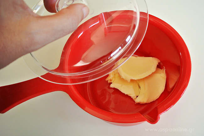 Συνήθως εγώ λιώνω το βούτυρο στο φούρνο μικροκυμάτων σε χαμηλή θερμοκρασία. Το σκεύος με καπάκι βοηθάει πολύ, αλλιώς καλύψτε το μπωλ με διαφανή μεμβράνη για να αποφύγετε το πιτσίλισμα.