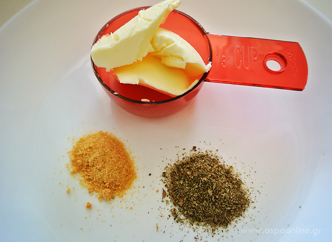 Λιώνετε το βούτυρο και το ανακατεύετε με το σκόρδο σε σκόνη και τη ρίγανη.