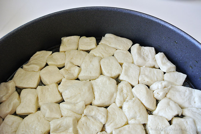 Καλύπτετε τον πάτο του ταψιού ομοιόμορφα με τα κομμάτια ζύμης.