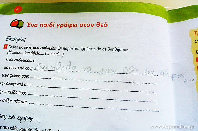 – Εβίτα γιατί δυσκολεύεσαι; Να, το γράφει… Θα φανταστείς ότι γράφεις γράμμα στον Θεό, ο οποίος θα μπορούσε να πραγματοποιήσει όλες σου τις επιθυμίες. Ξεκίνα από την πρώτη ερώτηση. Αν έγραφες ένα γράμμα στον Θεό, τι θα του ζητούσες πιο πολύ από όλα για σένα; Ποια θα ήταν η μεγαλύτερη επιθυμία για τον εαυτό σου;