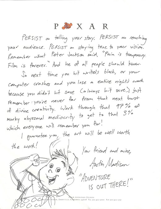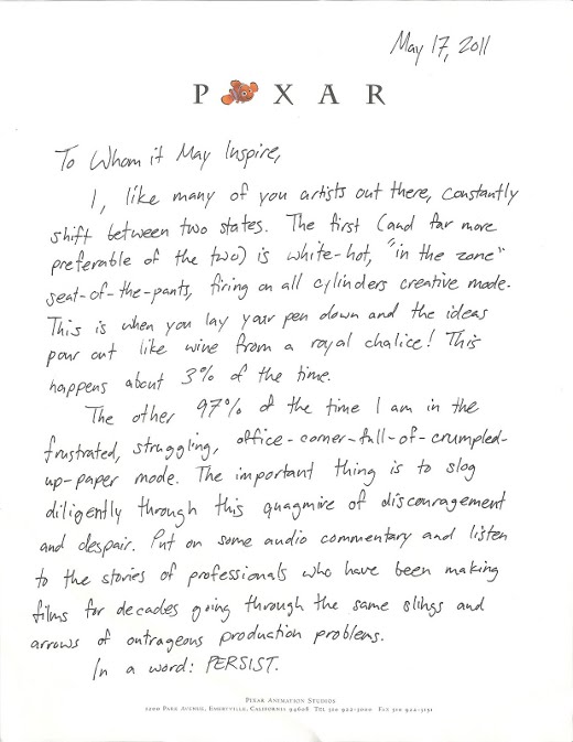 Με αυτή τη φράση ξεκινάει ο Austin Madison, animator στην Pixar, το χειρόγραφο γράμμα που έγραψε στα πλαίσια του Animator Letters Project. Μπορεί να απευθύνεται σε καλλιτέχνες και επαγγελματίες του δημιουργικού χώρου αλλά το μήνυμά του, αφορά όλους μας. Εμένα με ενέπνευσε! Ελπίζω να εμπνεύσει και εσάς.