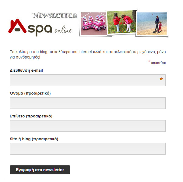 ✔ Τέλος όσον αφορά το δικό μου blog το Aspa Online, παρ’ όλο που χρησιμοποιώ όλα τα social media για την ευρύτερη διάδοση των posts, θεωρώ ιδιαίτερα σημαντικές και τις εγγραφές μέσω e-mail. Από σήμερα, εκτός από την απλή εγγραφή που είχα ανέκαθεν στο blog μου, όπου το κάθε νέο post αποστελλόταν αυτόματα μέσω e-mail, υπάρχει πλέον και η επιλογή της εγγραφής στο εβδομαδιαίο newsletter το οποίο είναι συγκεντρωτικό και συμπεριλαμβάνει: