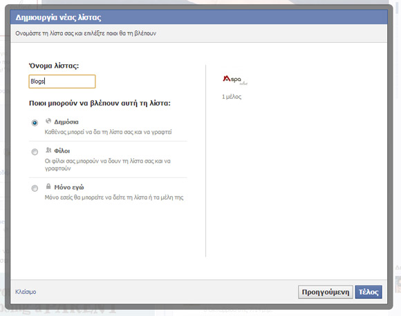 ✔ Στην επόμενη καρτέλα ονομάζουμε τη λίστα μας και ορίζουμε επίπεδο απορρήτου. Αν θέλουμε δηλαδή να είναι Δημόσια, Ορατή μόνο σε φίλους ή Ιδιωτική.