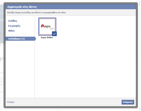 ✔ Η σελίδα εμφανίζεται επιλεγμένη όπως δείχνει το παρακάτω screenshot. Πατώντας στη συνέχεια στις επιλογές “Σελίδες”, “Εγγραφές”, “Φίλοι” μπορούμε να προσθέσουμε κι άλλες σελίδες (ή εγγραφές ή φίλους) στη λίστα μας.