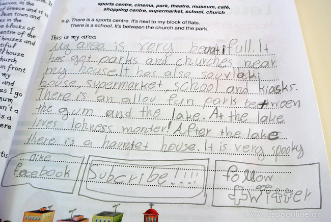 Το θέμα ήταν «η περιοχή μου». Δεν της πολυάρεσε. Φυσούσε και ξεφυσούσε. Αφού έγραψε: «H περιοχή μου είναι όμορφη. Έχει πάρκα και εκκλησίες. Έχει σουβλατζίδικο, σούπερ-μάρκετ, σχολείο και περίπτερα» κόλλησε. Δεν ήξερε τι άλλο να γράψει για την περιοχή μας για να γεμίσει τις υπόλοιπες γραμμές που έμεναν!