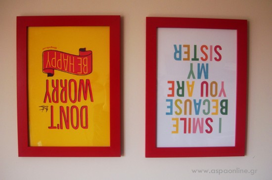 Αναποδογυρίστε από την προηγούμενη το βράδυ διάφορα καδράκια, διακοσμητικά ή παιχνίδια και δείτε τα παιδιά να ξεκαρδίζονται όταν θα ξυπνήσουν. Αυτό το κάναμε κι εμείς! Αυτά εδώ είναι τα καδράκια που είχα κρεμάσει πρόσφατα στο χώρο μεταξύ των δύο παιδικών δωματίων.