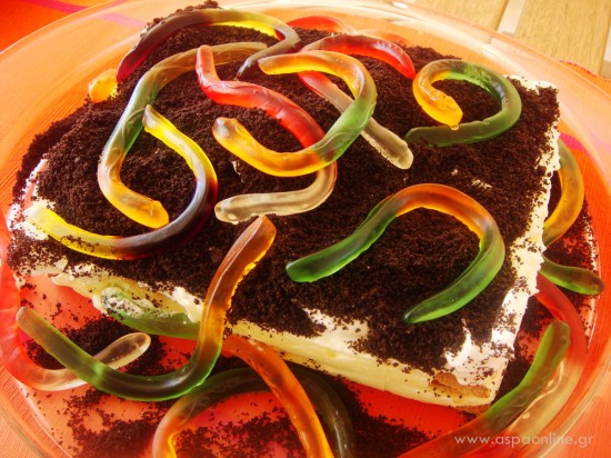 Μια και το σχέδιο για το σκουληκιασμένο μήλο στο σχολείο δεν μπορούσε να πραγματοποιηθεί άλλαξα λίγο τη φάρσα. Έβαλα σκουλήκια στο γλυκό. Όχι ένα και δύο, αλλά μία στρατιά σκουληκιών! Το γλυκό ήταν μιλφέιγ, το χώμα ήταν τριμμένα μπισκότα Oreo και τα σκουλήκια πεντανόστιμα ζελεδάκια.