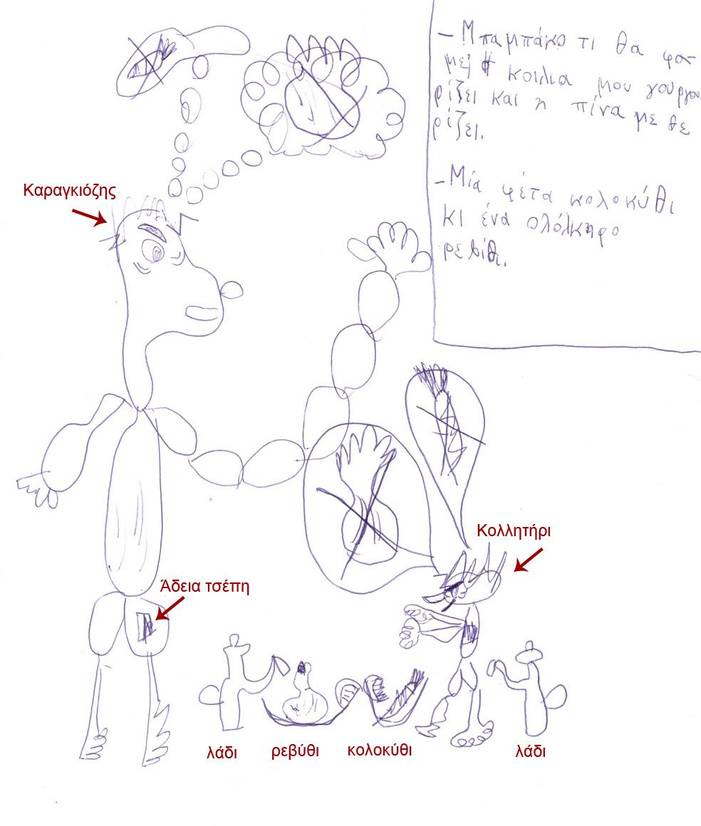 Κολλητήρι: Μπαμπάκο τι θα φάμε; Η κοιλιά μου γουργουρίζει και η πείνα με θερίζει! Καραγκιόζης: Μία φέτα κολοκύθι κι ένα ολόκληρο ρεβίθι! Το παραπάνω απόσπασμα από τον Καραγκιόζη είναι από το βιβλίο της γλώσσας της Πρώτης Δημοτικού. Η Εβίτα (6,5 χρονών) που η φαντασία της δε σταματάει να καλπάζει, πήρε μολύβι και χαρτί και έκανε […]