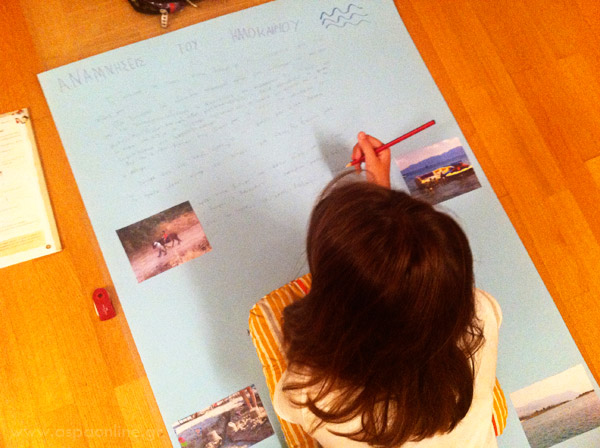 Την προηγούμενη εβδομάδα πήγα στη συνάντηση δασκάλας γονέων και είδα την εργασία τοιχοκολλημένη στην τάξη της, μαζί με εκθέσεις άλλων συμμαθητών της. Όλοι στο σχολείο την βλέπουν δηλαδή, μόνο το internet δεν μπορούσε να τη δει! Αδικία! Μου ξαναήρθε η επιθυμία να τη βάλω στο blog μου.